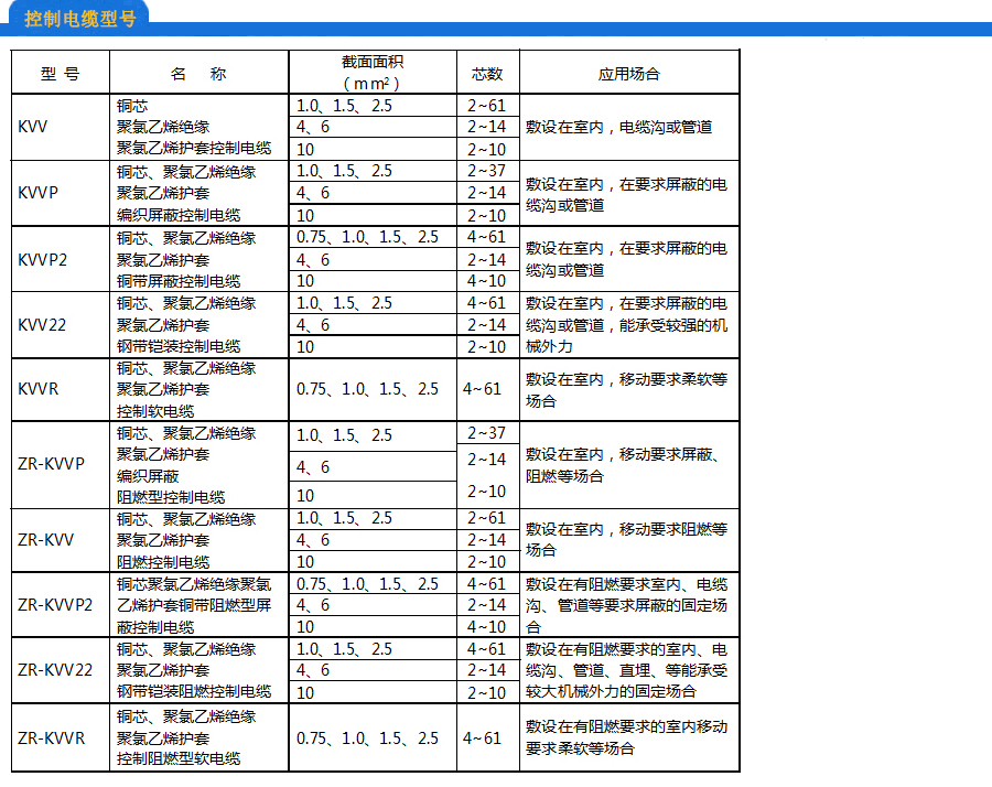 控制電纜是適用于工礦企業、能源交通部門、供交流額定電壓450/750伏以下控制、保護線路等場合使用的聚氯乙烯絕緣、聚氯乙烯護套控制電纜。