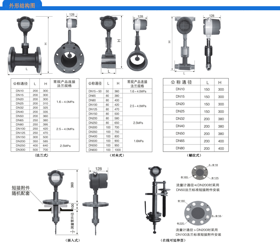 對夾式 法蘭式 插入式 在線可拆卸 管螺紋連接 |