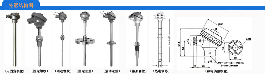 裝配式熱電偶是采用兩根不同材質(zhì)的偶絲作為測量原件,根據(jù)溫度范圍不同兩根偶絲的材質(zhì)不同,也就是對應(yīng)不同的分度號。熱電偶根據(jù)應(yīng)用場合的不同有不同外形的不同種類,但是大體都是由偶絲、保護(hù)套管、安裝固定裝置和接線盒組成。
