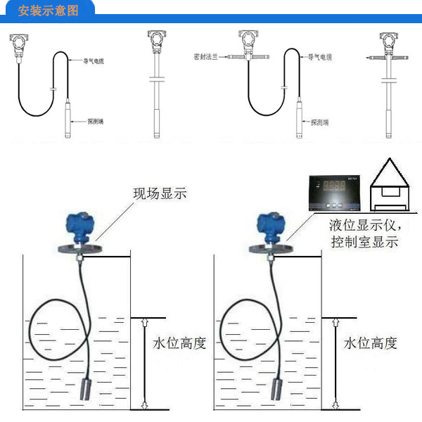 纜式 桿式 導壓式(不銹鋼鎧裝管引壓,傳感器在上部,適用高溫介質或腐蝕性介質) |
