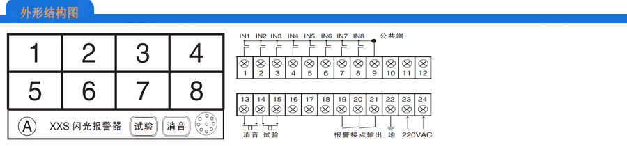 - YK-XXS系列八路閃光報警器與各種有電壓開關或者無電壓開關控制檢測儀表配合使用,能夠同時檢測8路報警點輸入信號,當報警輸入信號有效時,報警器將以屏幕閃爍以及發出蜂鳴聲的方